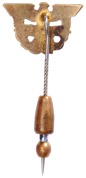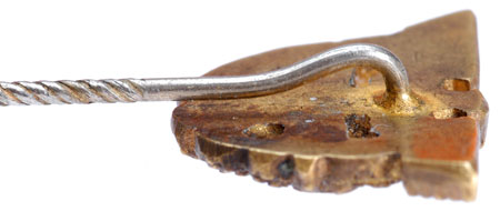 Gold plated die struck tombac, 22x14 mm, 45 mm knurled nickel pin with a brass lock, only traces of gold plating remain, light wear.