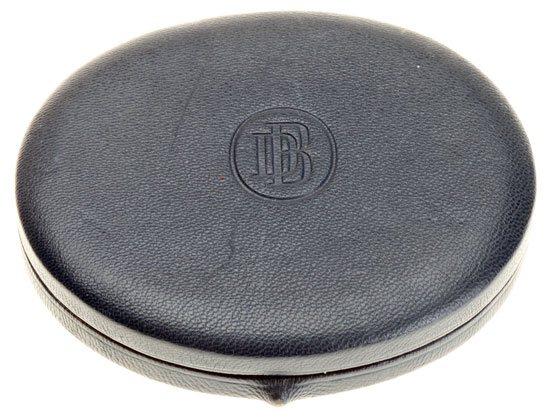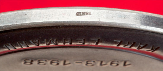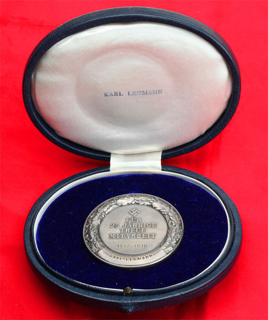 Deutsche Bank 25 Yrs Medal: Fur 25 Yahrige Treue Mitarbeit 1913-1938 Karl Lehmann; Solid silver, very high relief oak leaf wreath, 56 mm (2.2 inches), 81.5 gm, marked "silber" on bottom edge, virtually mint condition. Case: Navy blue leather covered wood box, DB initials on top, leather covers back hinge and push button lock, interior has a padded white silk lid stamped with the recipients name, base made of blue velvet with a 36 mm recess to place some kind of padded disk (missing) to fit into the medal's wreath to raise it just above it's oval velvet display pad. This is one of the finest 20th century German long service medals ever made, one that Germany's biggest bank could easily afford for it's faithful employees. Rare!