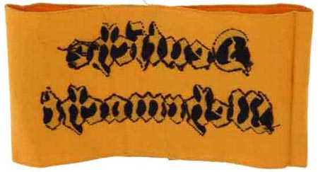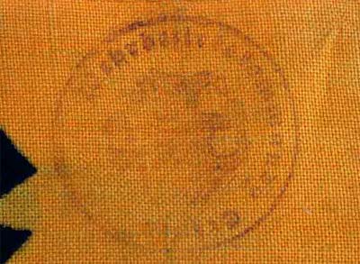 Yellow cloth body, 10 cm high, black bevo letters, inkstamp in upper right corner, excellent condition.