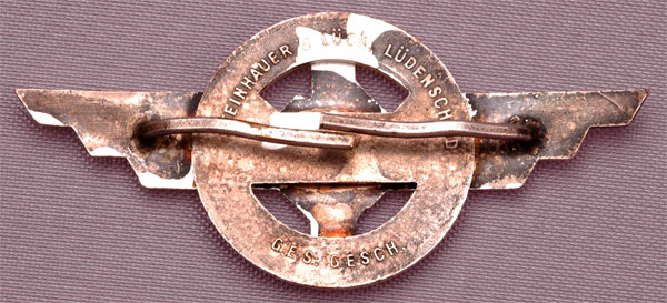 DLV Visor Cap Badge: (Deutsche Luftsport Verband): Nickle silver plated & enameled tombac, mercury silvered finish, 72 x 32 mm, 18.85 gm, this is the best quality maker of this badge: Steinhauer & Luck, Ludenscheid, Ges. Gesch.; heavy duty soldered prongs, small red enamel bruise, otherwise excellent, nice toning, WW2 vet estate purchase, light to moderate wear.