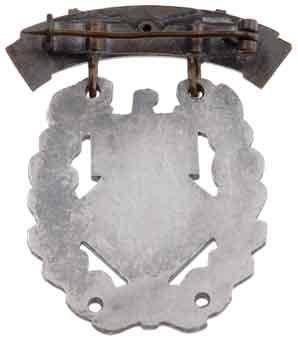 DRL/D.Sch.V. (Deutsche Schutzen Verband): Silvered tombac badge, 33 x 29 mm, red enameled suspension scroll, riveted crossed rifles, 10 x 35 mm, light wear.