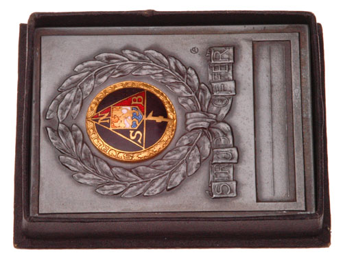 NSB (Nationaal-Socialistische Beweging) Struggle Sacrifice Plaque: feinzink, riveted enameled pin, 55 x 70 mm, awarded for members of the NSB who were killed in The Netherlands (very rare, about 30 known), designed by CA (Chris Agterberg), top of box is missing, unissued.