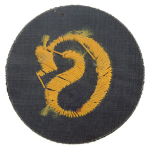 Schirrmeister EM Patch: 55 mm, dark green wool disk, raised gold cotton hand embroidered Gothic S, grey mesh fabric backing stamped "2," mint condition.