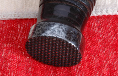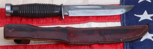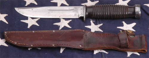 Case Quartermaster Knife: One piece leather grip, thick sturdy 6 inch blade used to pry open wooden crates, knurled pommel, like the face of a framing hammer, to hammer the crate nails back into place; brown leather sheath reinforced with eight steel staple studs; overall moderate wear.