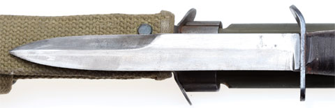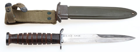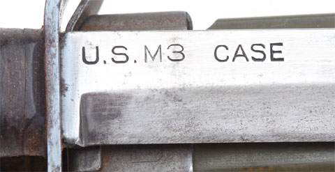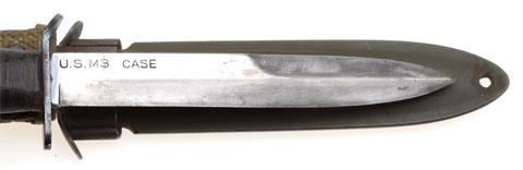 Fighting Knife US M3 Case: Fiber scabbard marked US M8 B.M. Co.; 6.5 inch lightly sharpened blade, peaned pommel, light wear on knife, scabbard is near mint condition.