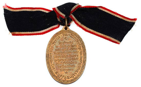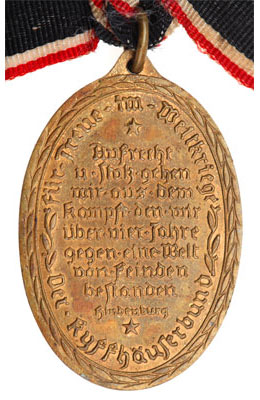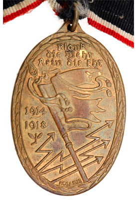 German 1914-18 Veteran's Medal: Fur Treue im Weltkriege, Hindenburg quote below. Tomback, 44 x 31 mm, light wear.