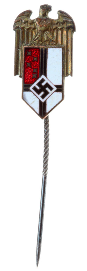 REICHSKOLONIALBUND Amtsträgerabzeichen: Enameled tombac, 24x13 mm, 50 mm knurled pin, Ges. Gesch., much rarer than the member pin without the eagle, rare officer pin, light wear.