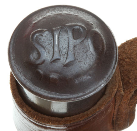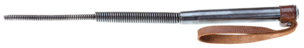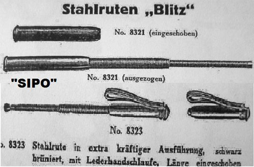 The Stahlrute (steel whip) was a deadly weapon. It came in two sizes, with or without a steel ball on the end. Hard strikes with a balled whip could break bones. A hit to the head could kill. Hidden in the front pocket, with a flick of the wrist it would be ready to strike in the blink of an eye. The less lethal small version was nicknamed the "Blitz" (lightning bolt). This is the large version, catalog No. 8321, but without the killer steel ball.