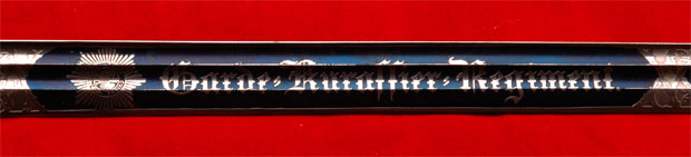Count Wrangel (East Prussia) Nr 3 Königsberg; it's last commanding officer was a Swedish volunteer count Gilbert Hamilton. Solid brass hand guard, triple wire wrapped blue ray shin grip, guard and scabbard are marked "GKR 3 E 135" (Guard Kurassier Regiment 3, xxx), maker W. Rohde, Berlin;