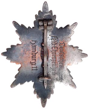 A private purchase piece officially called the "Deutsches Feld-Ehrenzeichen," made in Hamburg, the piece commemorated service in WW1. It was popular from 1931-35 as it denoted war service without requiring membership in other veteran organizations. Sometimes seen worn on early SA and early SS uniforms but not popular with the Stahlhelm, Kyfhauserbund, and Reichskriegerbund, subsequently banned in November of 1935. Three piece construction, plated, fire guilded, and enameled tombac, two rivets, 64x53 mm, small chip in bottom arm of cross, polished back, overall moderate wear.
