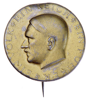 NSDAP Election Slogan Lapel Pin: Ein Volk, Ein Reich, Ein Fuhrer (One people, one nation, one leader): Stainless steel, gold brennlack obverse finish, non-magnetic, 28 mm, steel pin secured by a bent over tab, one of the best metal varieties made of this badge because it does not rust or tarnish, very light wear.