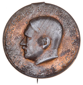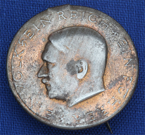 NSDAP Election Slogan Lapel Pin: Ein Volk, Ein Reich, Ein Fuhrer (One people, one nation, one leader): Stamped steel, brass plated, 28 mm, steel pin secured by a bent over tab, heavy wear.