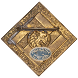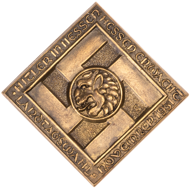 Hitler in Hessen LANDTAGSWAHL 1931: 41 mm tombac, Hessen lion overlaid on a stylized swastika background, framed by campaign text HITLER IN HESSEN HESSEN ERWACHT LANDTAGSWAHL NOVEMBER 1931, blue and white oval sticker, "S" marked on front right field.