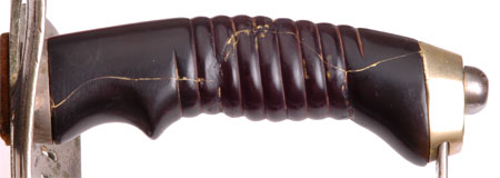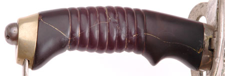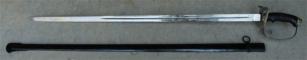 Baden Dragoon Reservist Sword: 32 inch plated triple engraved blade; 12.5 inch panels, the blued panel with crossed swords and mounted lancer reads: 2. Bad. Drag. Rgt. No 21., the other panel has a horse head and a platoon of galloping dragoons; hinged eagle basket guard; the black grip as you can see, was once shattered but masterfully repaired; a special wrench removes the top nut so the sword can be taken apart, re-blued scabbard has a number of small to medium dents, bottom of scabbard is stamped with the owners name and other information, missing one throat screw. Blade is light to medium wear, very nice panels, one side of the tip is getting dark. Overall condition on the other parts is medium to heavy wear.