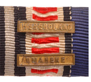 10 Item Ribbon Bar: Eight Imperial Ribbons, Two Imperial German South West Africa Clasps Hereroland and Omaheke (15 x 3 mm), Two WW1 Iron Crosses, Nazi 40 Yrs Service Cross. A very rare set, with research one might even identify the owner.