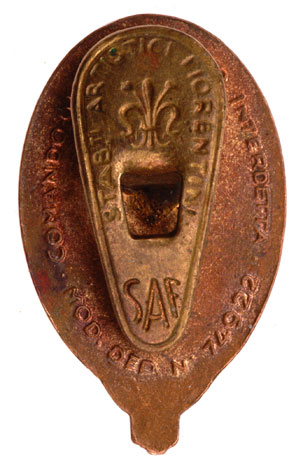 Enameled tombac, 26 x 15 mm, formal buttonhole mount, maker marked, excellent enamel, nice toning, light wear.