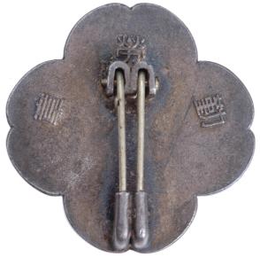 This badge is nicknamed the 'Golden Kite Badge for Industrial Warriors.' It was awarded to workers who displayed exceptional merit in the factories, including those who died in raids. Instituted in September 1942 by Imperial Edict in a number of classes. The design has enameled tomoe crests, four ball bearings, and a small girl inside a gear making an offering to the gods. Enameled nickle plated tombac, 30 mm, light wear.