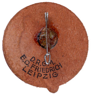 1936 KDF Hohenstein-Ernstthal Motorcycle Racing Badge: Two Motorcyclists, Great European Prize: pressed leather, 39 mm, glued steel pin, DRGM E. O. Friedrich Leipzig, mint condition.