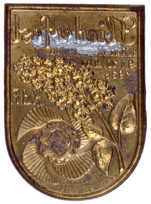 KdF Germersheim Spring Lilac Festival Badge: Brass plated steel, 30 x 40 mm, by F. Mannheim, Kaiserslautern, soldered safety pin missing, some rust on rev, light to moderate wear.