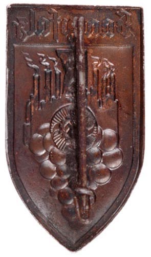 Winery Equipment and Grapes: stamped bronze anodized aluminum, strong steel pin with some rust, 25 x 44 mm, light wear.