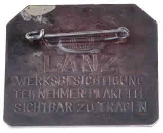 WW2 Lanz Factory Badge: made of aluminum alloy, 45 x 50 mm trapezoid, steel pin, maker J. Preissler Pforzheim. Back inscription reads: LANZ Werksbesichtigung Teilnehmer Plakette Sichtbar zu Tragen (Lanz Factory Inspection Participant Badge visible to wear). A rare badge, maybe only a hundred or so were made.