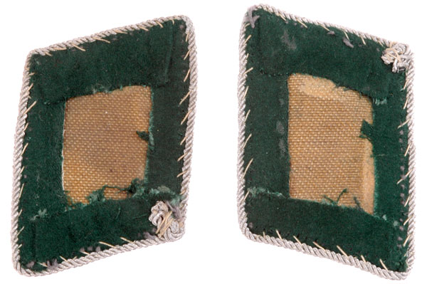Luftwaffe Administration Leutnant Collartabs: Dark green wool over shellacked tan buckram, three kinds of bullion for piping and design, approx 40 x 50 mm, one tab is slightly larger, one small oxide spot on bullion, moderate wear.