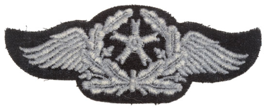Flight Technical Patch: Machine embroidered insignia on grey-blue wool, black fabric backing, 10 x 4 cm, mint condition.