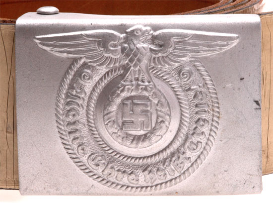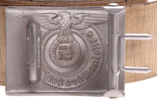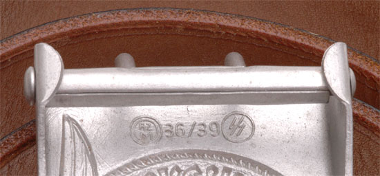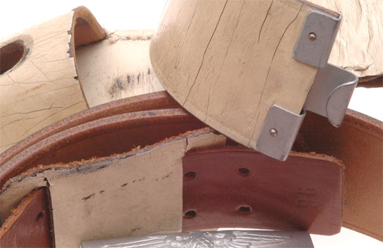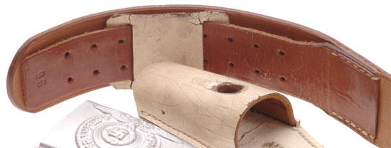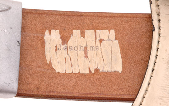 Liebstandardt Adolf Hitler Parade Buckle, Belt, and Frog: Aluminum EM Buckle marked RZM 36/39 SS, Leather Belt marked size 96 (cm) with a leather prong guard and a paper owner's label, last name "Joachims;" plus a matching unmarked leather frog. After 85 years the acrylic white lacquer paint shows crazing but the leather is still pliable, very rare!, near mint condition.