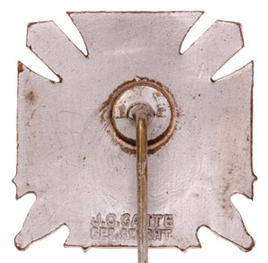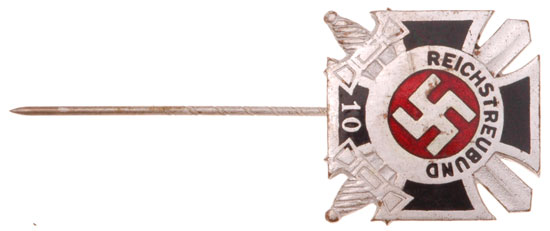 Reichstreubund: Enameled Tombac, silver brennlack finish, 24 mm cross, 50 mm knurled pin, J. C. Gante Ges Gescht, very light wear.