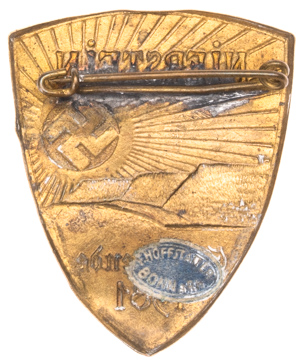Nierstein Sonnwende 1931: Solstice celebration, 36 x 44 m, tombac, shield shaped landscape scene, radiant sunburst rises over the hills with large swastika position in the sun, maker mark sticker