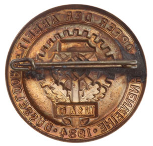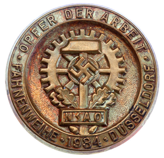 NSAO (Nationalsozialist Arbeitsopfer) Fahnenweihe Dusseldorf 1934: Opfer der Arbeit (Victims of Labor): Tombac, 34 mm, a very rare labor department of the DAF to benefit workers injured in industrial accidents, the first one I have seen, mint condition!