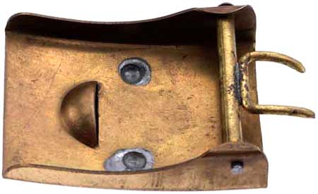 NSBO Buckle: Solid brass, plated mirror-like finish, nickel plated and black antiqued roundel, 65 x 45 mm, typical no maker mark, brass catch secured by a steel pin, an early scarce buckle, light to moderate wear.