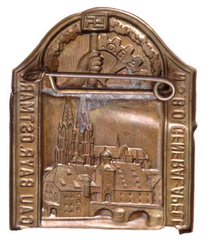 General Apell: Tombac, 35 x 41 mm, soldered brass pin, dent in center, broken bottom edge, nice even brown color, light wear but damaged.
