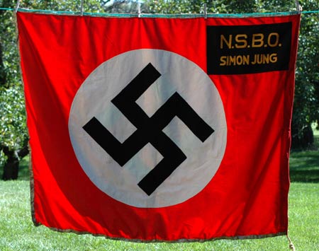 NSBO Simon Jung Standarte: Early pre-war 4x5 ft NSBO double sided flag, 12 piece construction, red cloth body 4x5 ft, two 10 x 17 inch black cloth patches with yellow machine embroidered letters, fancy 2 cm aluminum bullion border on 3 sides, two 33.75 cm roundels, two 4 pc 9 cm wide swastikas, loop and rope lanyard sewn into the hoist side, light wear.