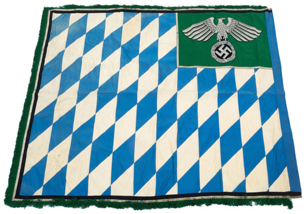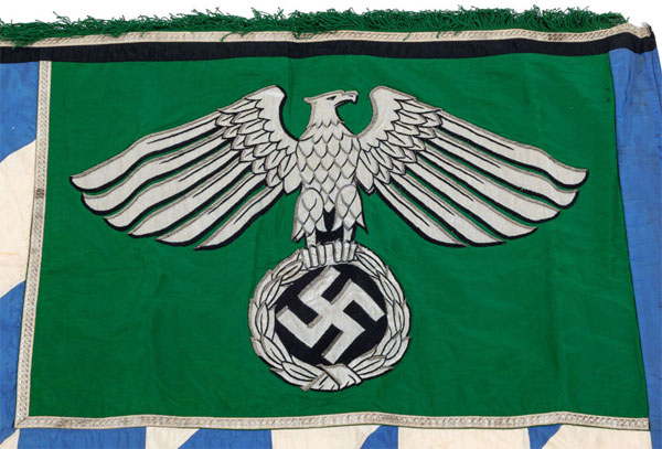 Unknown NSDAP Standard: Bavarian colored field (173 x 145 cm = 5.7 x 4.7 ft) in blue and white rayon lozenges is bordered with black rayon and aluminum bullion stripes and a 4.75 cm twisted green rayon fringe. Inside the green rayon patch (66 x 54 cm = 2.1 x 1.75 ft) is an extremely detailed NS eagle perched on a swastika inside a laural wreath. The aluminum bullion eagle and laural wreath are detailed with twisted aluminum bullion piping and black rayon thread. This flag is larger than a full sized 4x4 Army or Luftwaffe standardt, is extremely rare (possibly unique), and is in absolutely mint condition.