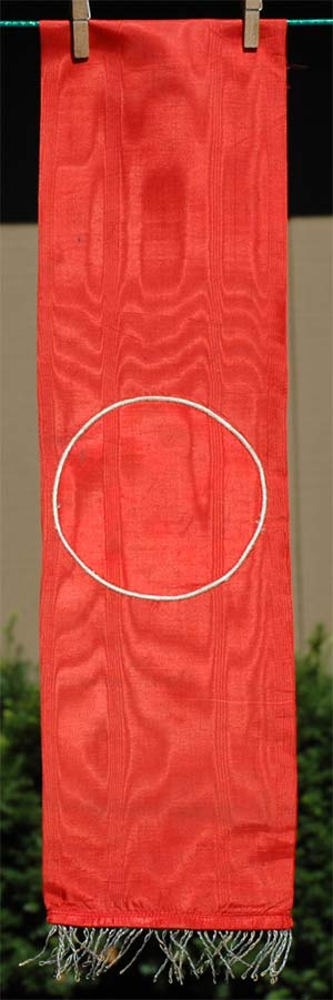 Three piece construction, cut-off sash made from a 17.0 cm wide strip of red watered silk-rayon fabric, currently 66 cm in length but the vet probably cut off the other end, printed swastika on a white silk-rayon surge-sewn circle, 5 cm silver bullion fringe, good for some kind of a display.