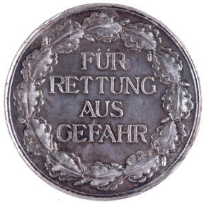 NSDAP Silver Lifesaving Medal: 50 mm, 55.5 gm, marked on rim "835 PR Munze Berlin" (835 Fine, Berlin Mint), back reads "Fur Rettung Aus Gefahr" (For Rescue Out of Danger), natural steel grey toning, light to moderate wear.