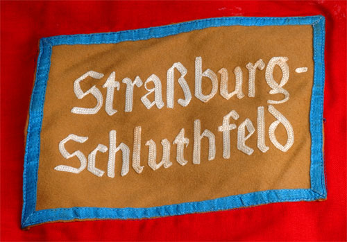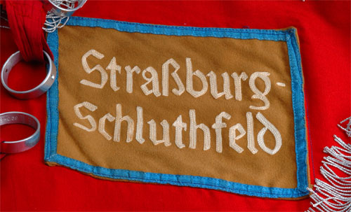 Strassburg Schluthfeld: Double sided, nice quality red cloth field 127 x 115 cm (45x50 inches), swastika disc 86 cm (34 inches), brown wool patch 20 x 16 cm with white chain stitched letters and 1 cm blue rayon tress border, perfect 5 cm aluminum bullion fringe; seven aluminum pole rings (inside diameter 4 cm) some marked inside RZM M3/40/39, others 41, top and bottom rings have recessed holes for pole fasteners, flag was actually used once or twice - bottom cloth loop has been sewn back on plus there is evidence of light wear inside the rings, overall very light wear, well taken care of, probably in the same condition it left Strassburg in late November 1944 as a war trophy taken by a soldier in the 44th Infantry Division. Schluthfeld was a major downtown stop on the A-Tram railway constructed in 1877 by the Straßburger Pferde-Eisenbahngesellschaft. A rare standarte from a territory the Germans were going to annex (reclaim) if they won the war.