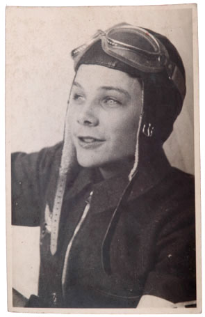 NSFK Portrait Photo Postcard: Young HJ Boy in leather flight helmet with large goggles, nsfk insignia on right breast, 8x13 cm, light wear.