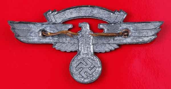 NSKK Hat Eagle: Late war, die struck, zinc alloy, 70 x 35 mm, silver colored wash or plating, soldered brass prongs, marked M1/52 RZM, excellent to mint condition.