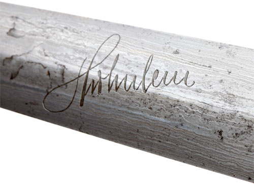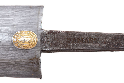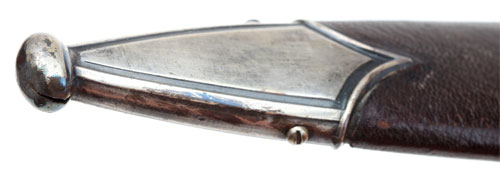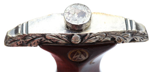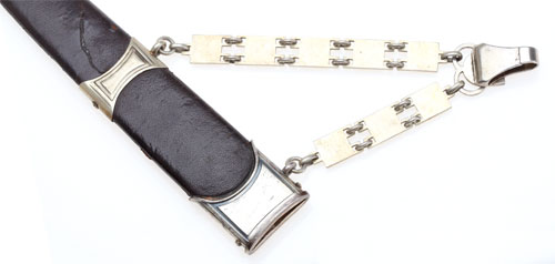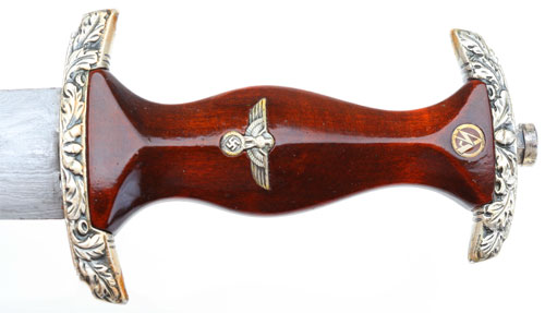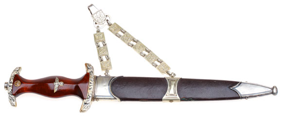NSKK Huhnlein Damascus Honor Dagger: Maidenhair damascus blade, one side has the gilded motto "Alles Fur Deutschland" between oakleaf sprigs; the other side has the central 30 degree "Huhnlein" signature and the guilded oval "Carl Eickhorn Solingen" squirrel hallmark down by the crossguard; one side of the tang is stamped "Damast," the other side has a stamped "110" bench number. The shellacked oakleaf crossguards are very heavy and appear to be solid silver, total weight 82.0 grams (2.6 troy oz), each one is stamped with a "148" bench number, the inside of each crossguard has oxidized blue after 75 years, the color of silver nitrate! The blade fits perfectly against the lower crossguard. The magnificent shellacked maroon colored wood grip is a perfect fit for both crossguards. The steel scabbard is straight, covered with four fitted pieces of thin dark brown Moroccan leather stained black with traces of a much darker black polish. The leather fits up against but not under the three scabbard fittings. The bottom ridge of the leather has heavy wear where the owners fingers would be to keep the dagger from swinging. One of the back leather pieces has a 3.5 cm tear, probably caused by catching on a car seat or a chair. The center ramp anchoring the chain has the unique, high profile, flared rectangle, only seen on an NSKK High-Leaders dagger. The screw on the center fitting is a plated tomback replacement. The other four are the correct, high-dome, nickel-plated brass screws. The chain is the standard NSKK High Leader type, eight solid nickel links and unmarked because it was not controlled by RZM regulations. The NSKK Huhnlein Damascus Honor Dagger is much rarer than the SA High-Leader Honor dagger. Over-all light to medium wear, extremely rare!