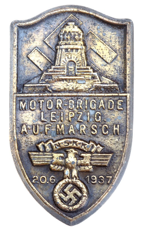 NSKK Motor Brigade Parade Badge - Leipzig 1937: bronze plated tomback, 50x29 mm, soldered and plated steel pin, light to moderate heat damage.