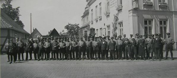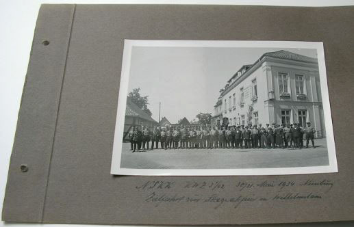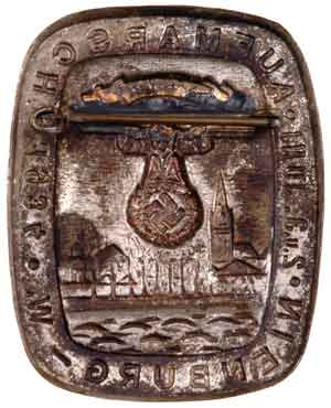 NSKK 1934 Nienburg-W. Parade Badge: Silvered tombac, 37x47 mm, scarce, light wear. Amazingly, a group photo of the men who gathered before the Nienburg march exists on a German website that sells memorabilia. The badge was sold to the participants and the public to help fund the expenses of this political event. It cost money to join the NSDAP.