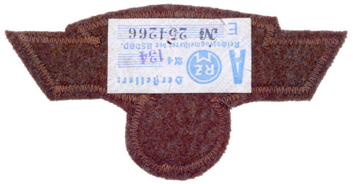 Machine embroidered aluminum flatwire eagle on olive-brown wool, 100x52 mm, RZM tag on back, mint condition.