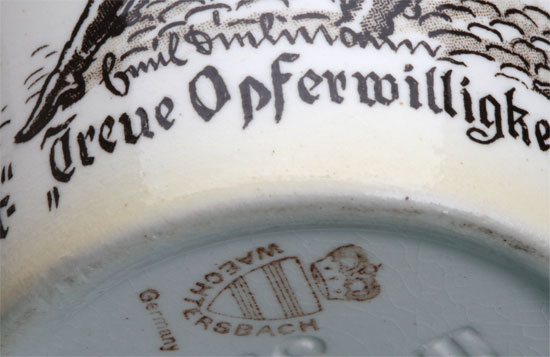 Color Porcelain Cup: 11 x 8 cm, Nurnberg Die Reichsparteitag Stadt (Nurnberg, the National Party Day City); Parade of SS, SA, RAD, HJ, and DJ over this A.H. quote from Mein Kampf: Treue, Opferwilligkeit, Verschwiegenheit sind Tugenden die ein grosses Volk notig braucht (Loyalty, spirit of sacrifice, discretion are necessary virtues that a great people needs), bottom marked with a crowned shield, Waechtersbach Germany (founded 1832), and 985/3, very rare, excellent condition.