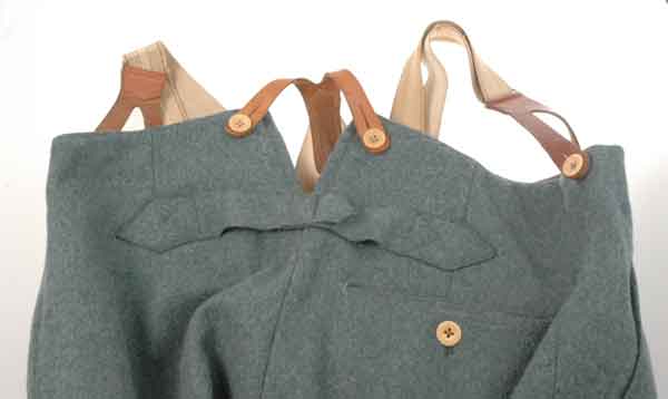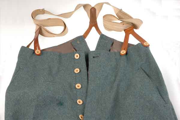 Green wool pants, four pockets (a right front for a watch, two sides, and a button down right back), five button fly, and six waist suspender buttons. The inner waistline and fly are lined with a high quality ribbed grey rayon. The rayon has size, police, and year stamps. All the pockets have reinforcement stitches. The legs have a 4 cm hidden cuff and a 1.5 cm rayon lining. The suspenders have a decorative weave and the leather tabs are double stitched, supple, and in excellent condition. The pants have a few spots of period darning repairs using green thread of a different color than the wool. One of the repairs is really incredible - virtually invisible on the outside but you can see a patch when you turn the leg inside out!!! The inner back waist has a loop for hanging. These pants are for a pretty big 6 foot man (figure it out from the size stamp: 2.54 cm = 1 inch). Overall condition is very fine to excellent.
