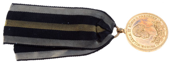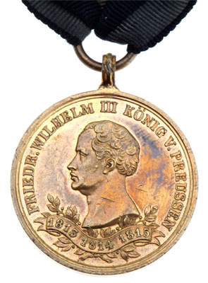 Prussia 1863 Commemorative Medal for Veterans of the Napoleonic Wars: Tomback, awarded in bronze for combatants, 29 mm, 13.5 cm original ribbon w/yellow-black-white stripes; 1813, 1814, 1815. The medal was instituted by King Friedrich Wilhelm III on the 17th of March 1863 to mark the 50th anniversary of the wars against Napoleonic France and its allies that culminated in victory at Waterloo on 18 June 1815, scarce, mint luster, light wear.