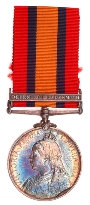 Defense of Ladysmith: Solid Silver, 36 mm, original ribbon, edge reads: 172445 ORD: J. F. NAIL, H.M.S. POWERFUL; beautiful iridescent toning, virtually mint condition.