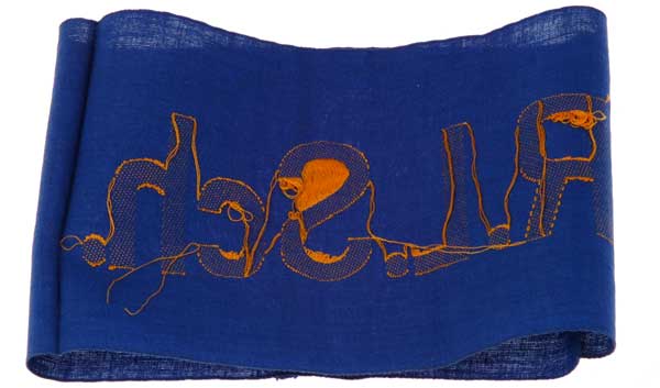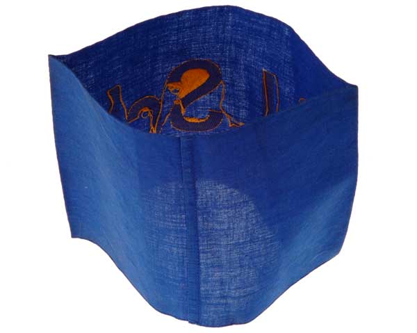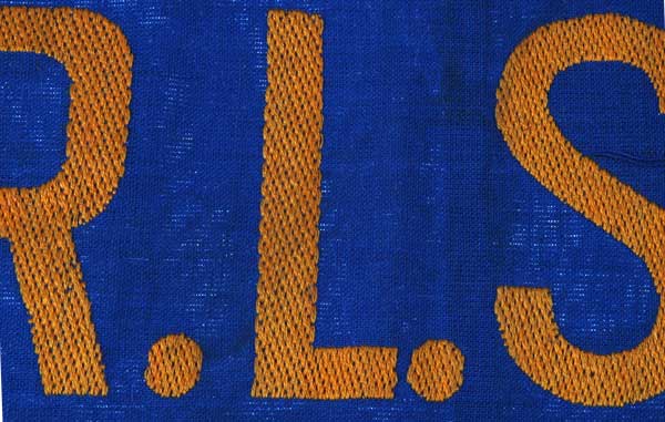 Blue cotton band, 13 x 39 cm, gold rayon bevo weave letters, 1.5 cm loom flaw on two blue threads inside the "S," virtually mint condition.
