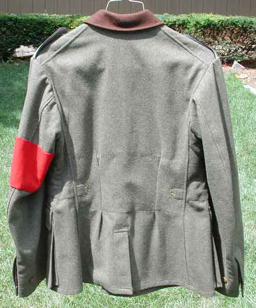 RAD Arbeitsmann Tunic: model 1936, five button front, four pockets, wool Nazi party armband on left sleeve, pebbled aluminum buttons marked "K 39," loose label in pocket reads "Arbeitsmann Vogel," bandage pouch right inside front, excellent condition.